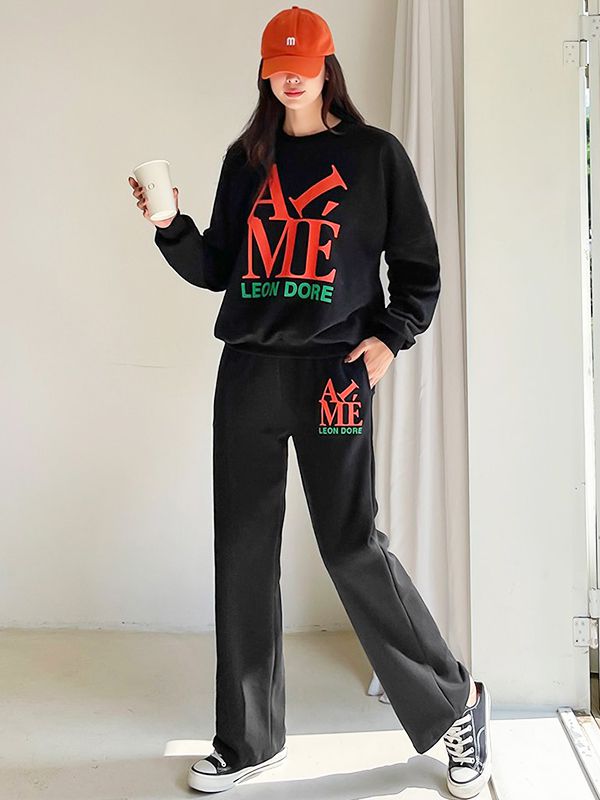 【C55660】韓國PSS 螢光字母套裝-圓領英文長袖上衣+鬆緊腰直筒長褲★★