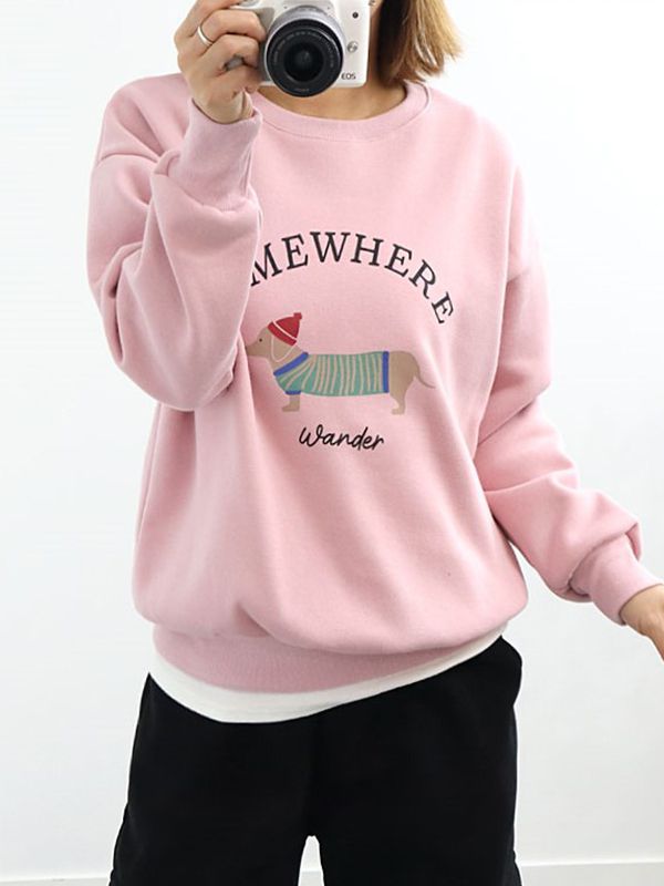 【C55674】韓國MIS 臘腸狗印花上衣-厚實內刷毛好氣色寬鬆字母長袖★★