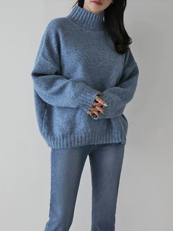 【C55679】韓國MAZ 蓬鬆高領針織衫-素面寬鬆落肩長袖混羊毛上衣★★