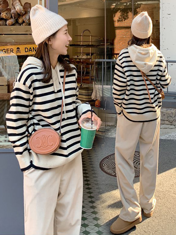 【C55817】韓國MBL 連帽條紋針織衫-抽繩Y字領厚實面料長袖上衣★★