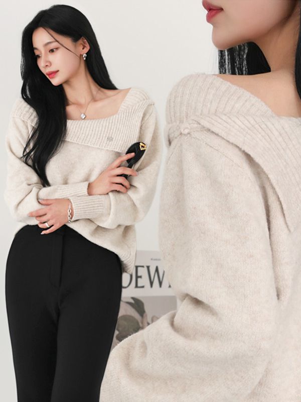 【C55906】韓國PPI 斜肩翻領針織衫-素面不對稱一字領金屬標長袖上衣★★