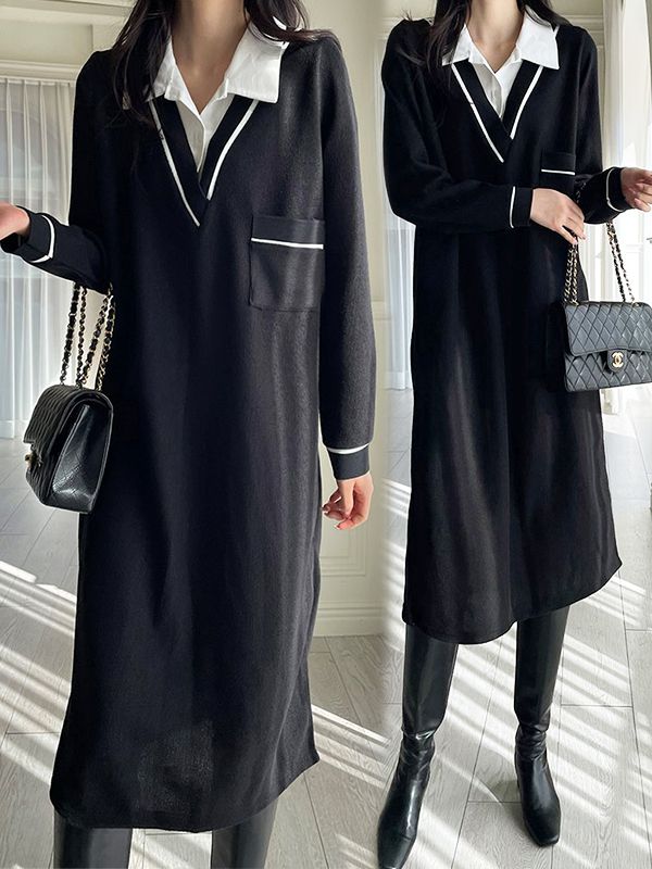 【C55913】韓國MNR 襯衫領洋裝-假兩件拼接白條素面口袋寬鬆長袖★★