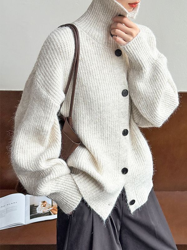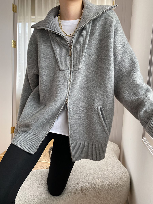 【C60021】品牌 高領針織外套-雙開式拉鍊寬鬆素面混羊毛翻領長袖★★