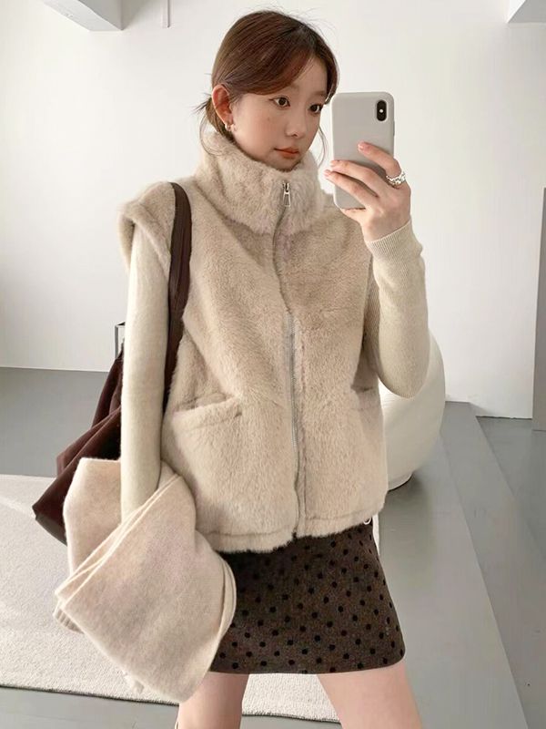 【C73705】品牌 立領毛毛背心-素面雙口袋抽繩收腰無袖拉鍊外套★★