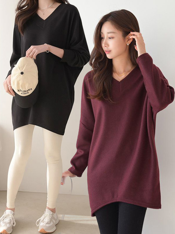 【C55181】韓國DLY 長版V領上衣-前後V領素面寬鬆倒V下襬長袖T恤★★