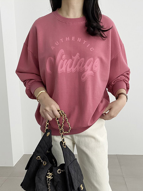 【C55467】韓國DLY 撞色學院風上衣-寬鬆復古字母膠印圓領長袖大學T