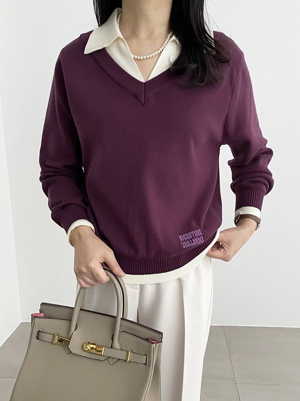 【C55476】韓國RUN 襯衫領針織衫-刺繡字母V領假兩件好氣色長袖上衣