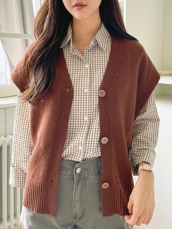 【C55486】韓國LUS 羊毛針織背心-小包肩短袖素面排釦V領針織外套