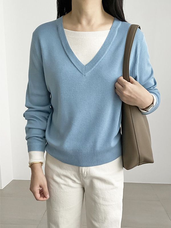 【C55487】韓國RUN 拼色針織衫-素面假兩件拼接V領輕薄羊毛長袖上衣
