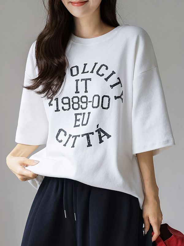【C55493】韓國CFX 圓弧字母T恤-寬袖復古斑駁感圓領長版七分袖上衣