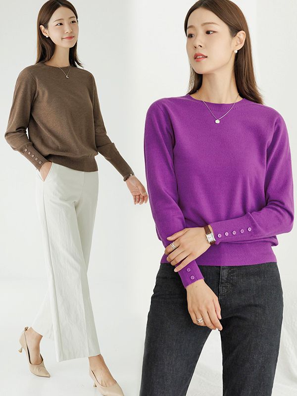 【C55494】韓國DED 鈕釦袖針織衫-素面好氣色圓領親膚混羊毛長袖上衣