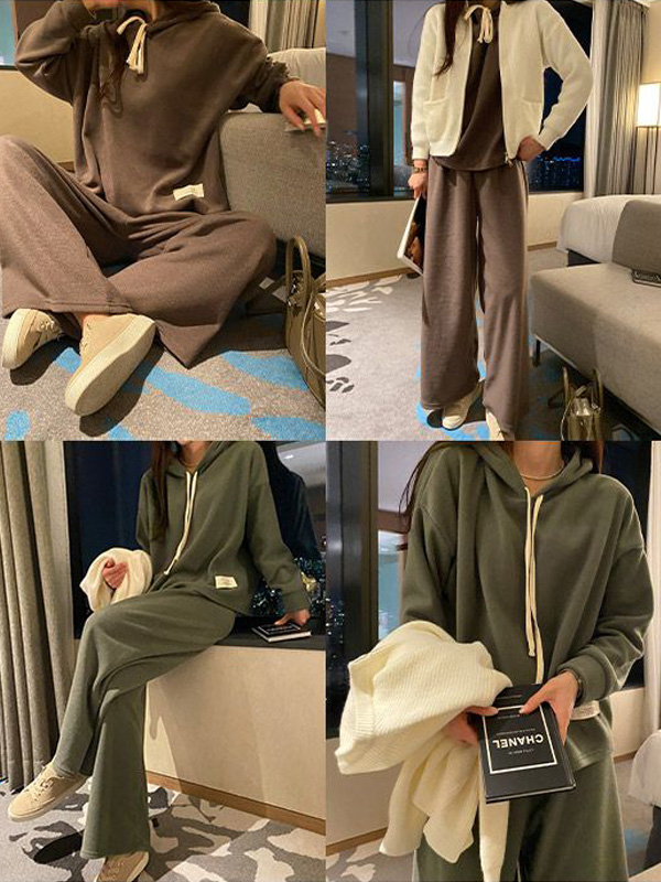 【C55739】韓國MNR 抽繩毛呢套裝-素面寬鬆布標長袖上衣+鬆緊腰長褲