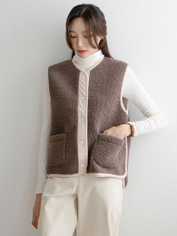 【C55742】韓國MCD 素面羔羊背心-前短後長無袖開襟壓釦撞色滾邊外套