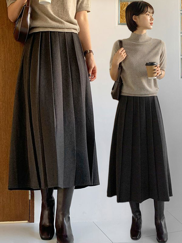【C55749】韓國PUR 毛呢百褶裙-OL素面A字裙後腰鬆緊傘狀長裙