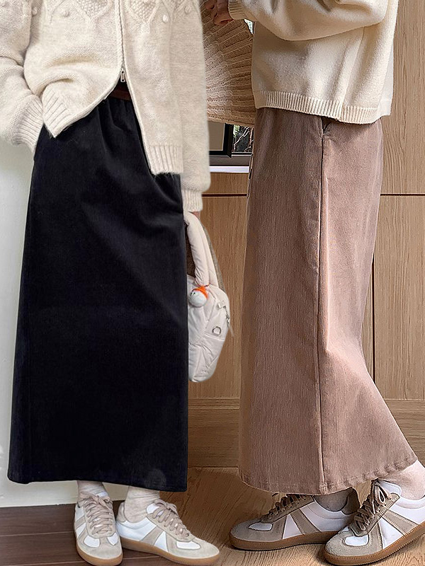 【C55750】韓國PUR 燈芯絨窄裙-素面抽繩鬆緊腰後開衩厚實長裙