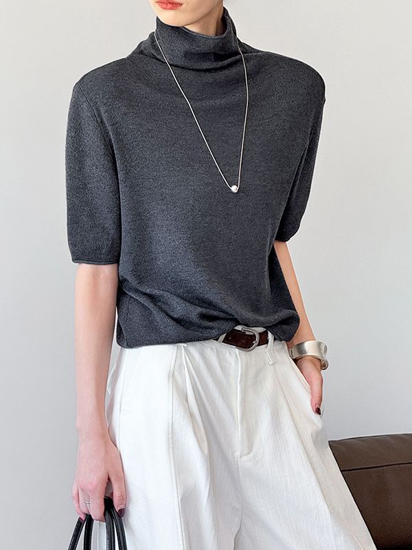 【C60088】品牌 捲邊高領針織衫-素面寬袖彈力內搭五分袖上衣★★