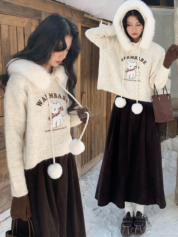 【C73731】品牌 小白狗連帽針織衫-字母狗狗印花毛球連帽長袖上衣