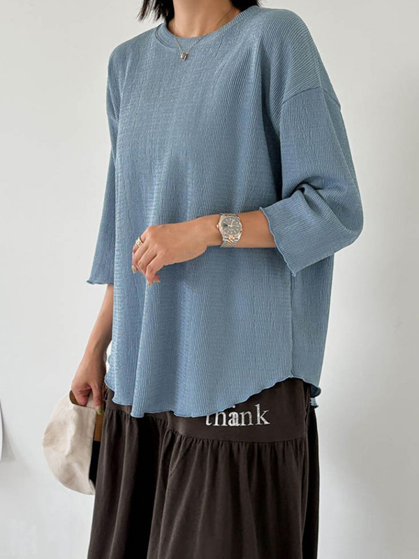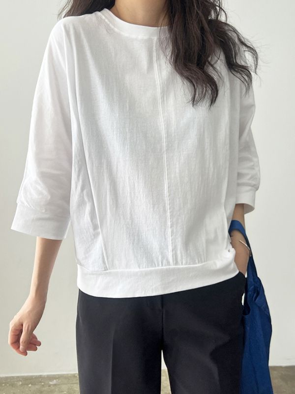 【C55488】韓國MRC 立體車褶T恤-素面圓領內切腰線七分寬袖上衣★★