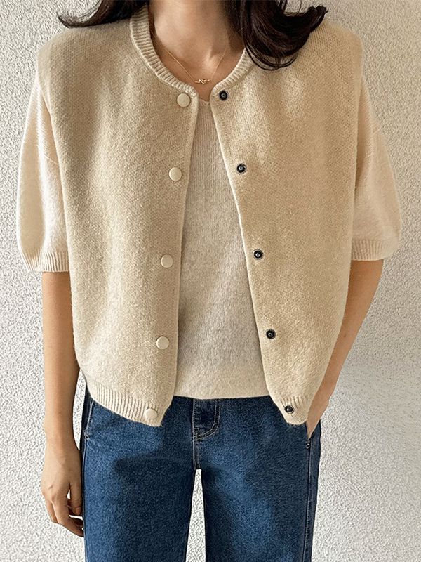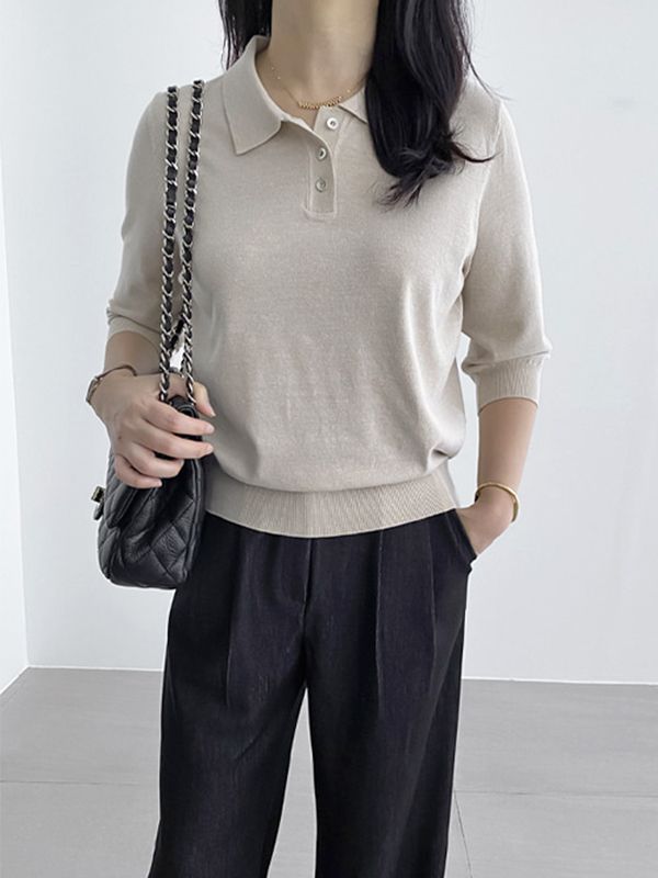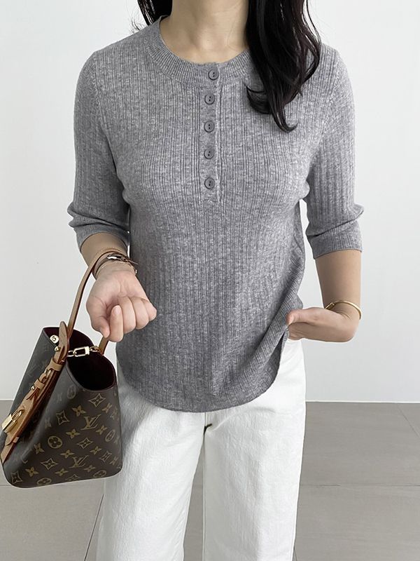 【C55459】韓國RUN 圓圈鈕釦針織衫-素面半開襟領柔軟五分袖上衣