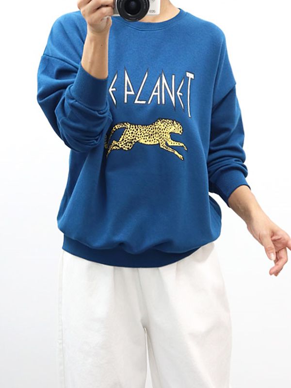 【C55388】韓國MIS 獵豹印花上衣-個性字母圓領休閒束口長袖大學T★★