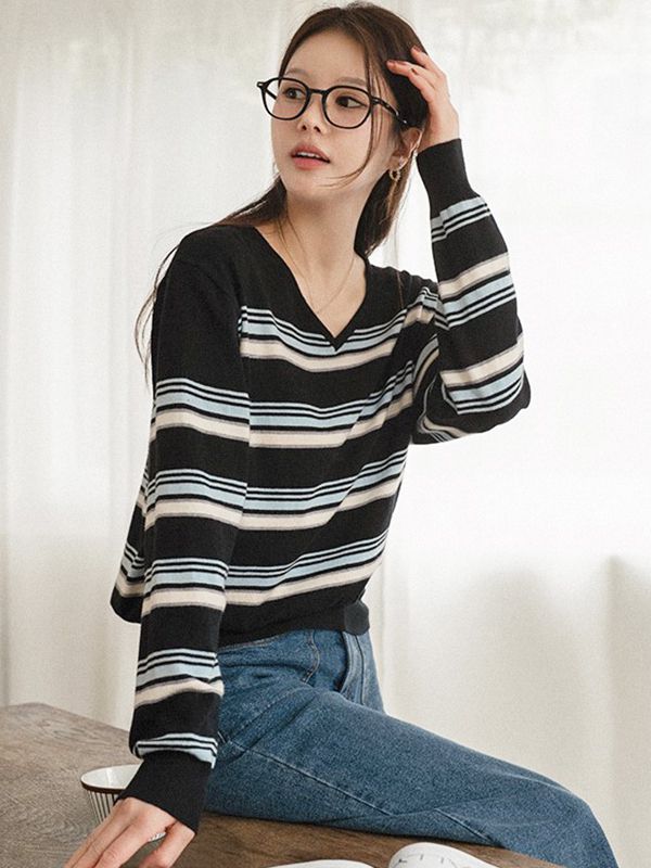【C55492】韓國CAN 三色條紋針織衫-深V領橫條紋柔軟親膚長袖上衣★★