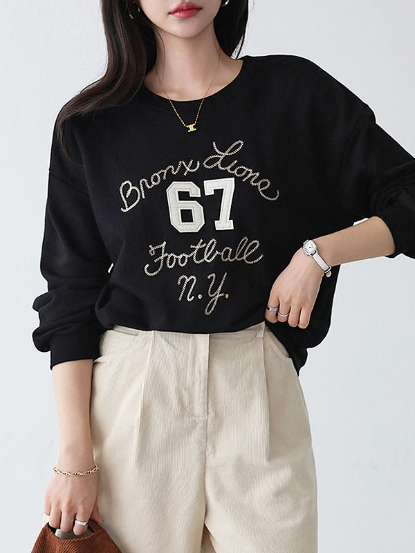 【C55522】韓國PPI 車布數字大學T-67字母刺繡英文圓領長袖上衣