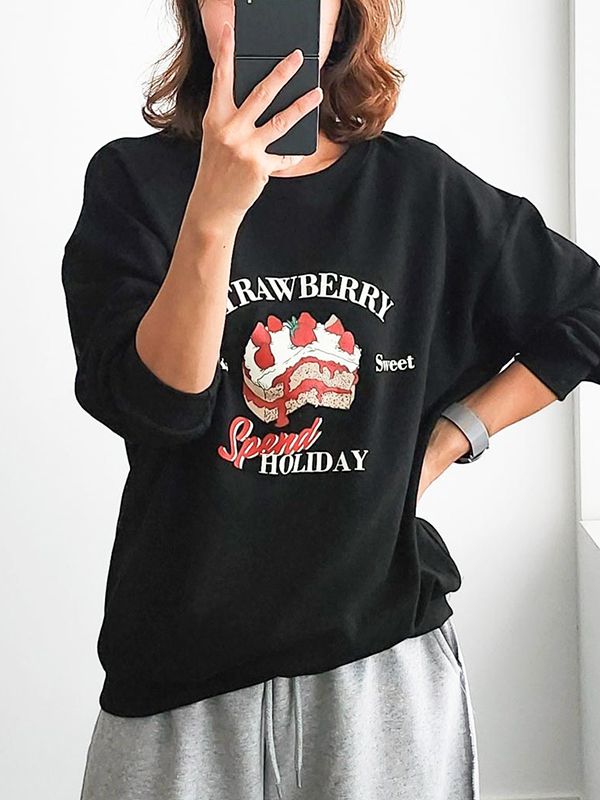 【C55541】韓國MIS 草莓蛋糕上衣-圓領字母印花寬鬆剖面圖長袖大學T