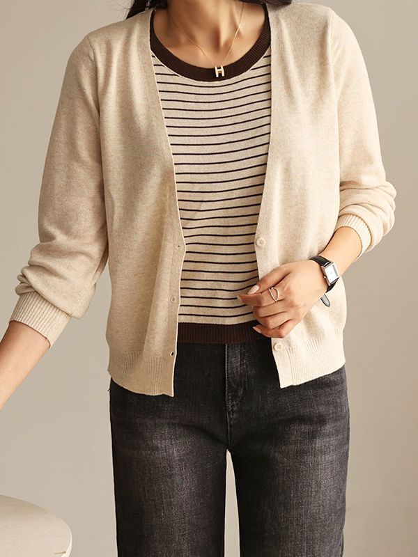 【C55414】韓國MAZ 開釦針織衫-柔軟雙領片素面V領長袖上衣外套