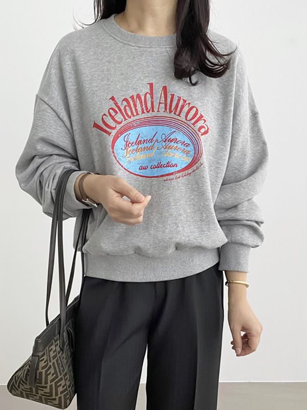 【C55638】韓國PSS 山脈印花大學T-字母圓領後襬開衩布標長袖上衣★★