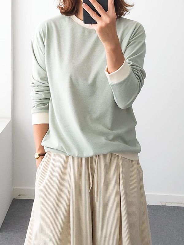 【C55603】韓國MIS 絨毛素面上衣-好氣色撞色滾邊圓領親膚長袖T恤★★