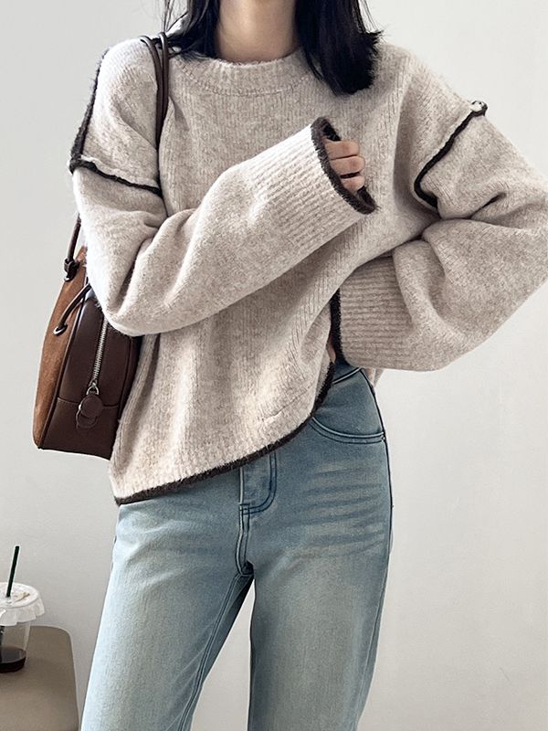 【C60012】品牌 反車線針織衫-素面撞色滾邊不對稱長袖混羊毛上衣★★
