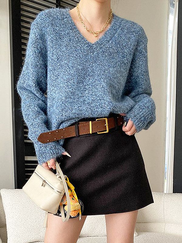 【C55718】韓國MNR 針織彈性連身裙-寬鬆素面深V領落肩長袖洋裝_影片★★