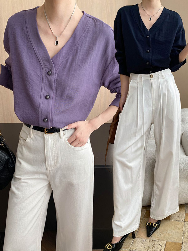 【C60121】品牌 Y字領襯衫-素面好氣色V領排釦透氣棉麻長袖上衣