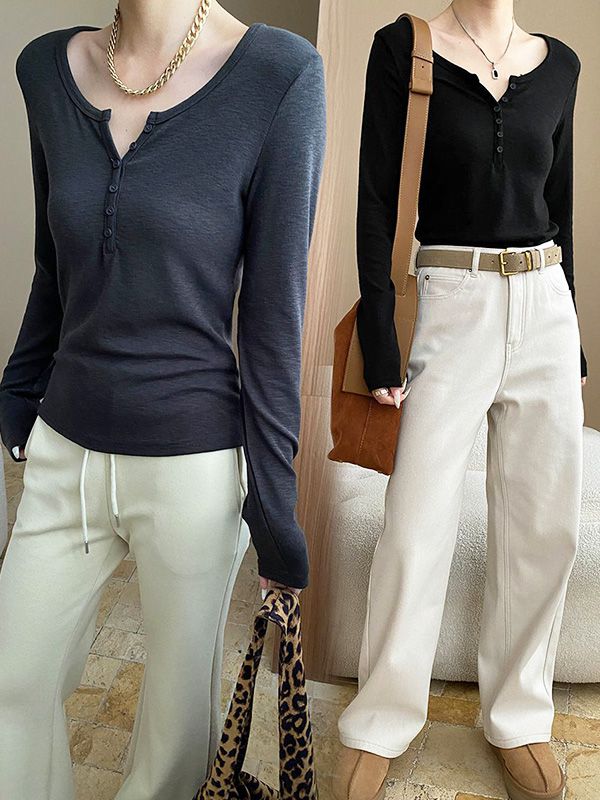 【C60124】品牌 短版內搭上衣-素面半開襟排釦U領合身長袖T恤
