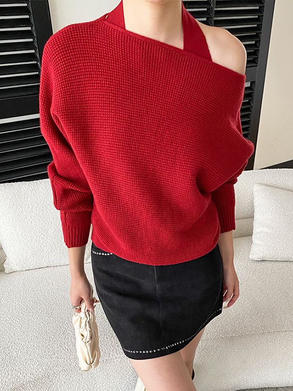 【C60129】品牌 針織套裝-露背繞脖無袖背心+素面一字領長袖上衣★★