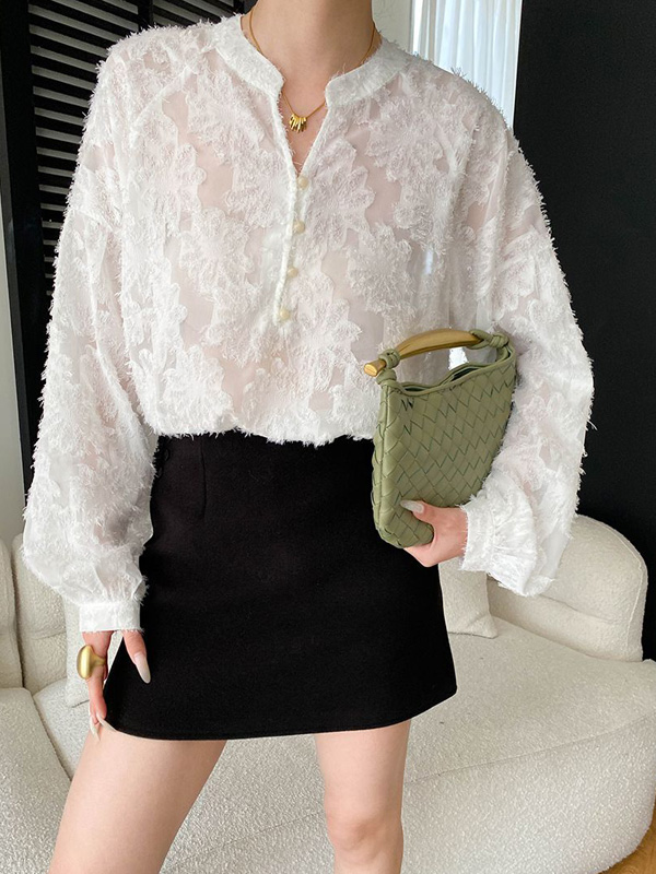 【C60132】品牌 透膚緹花襯衫-V領立體蕾絲雕花寬袖長袖印花上衣★★
