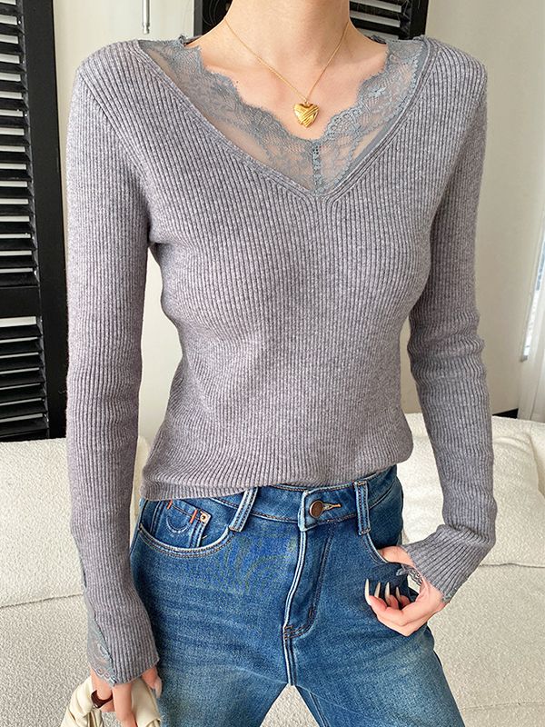 【C60136】品牌 蕾絲V領針織衫-素面彈力坑條雕花滾邊長袖上衣
