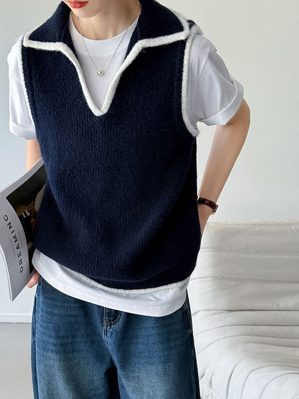 【C60139】品牌 滾邊針織背心-素面撞色白邊V領無袖外搭上衣