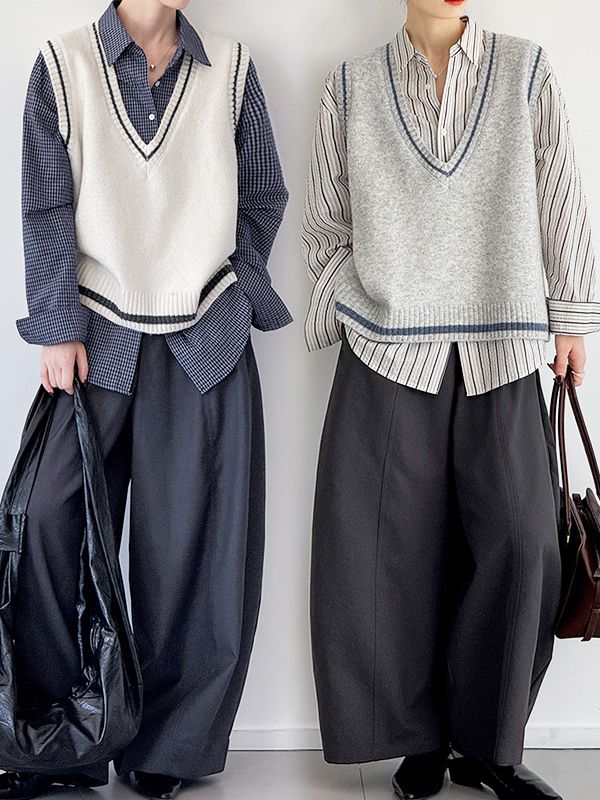 【C60143】品牌 線條滾邊背心-寬鬆素面深V領寬肩無袖針織上衣★★