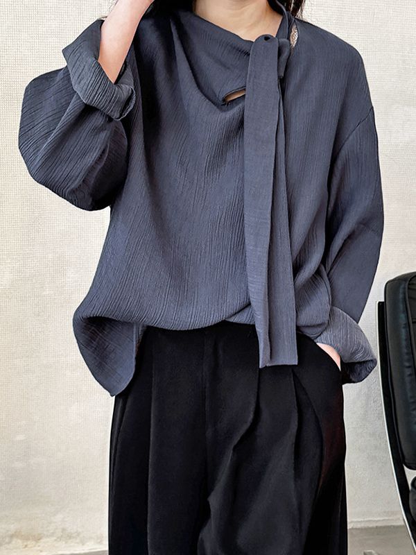【C60148】品牌 絲帶領襯衫-不對稱綁結領口素面波紋長袖上衣