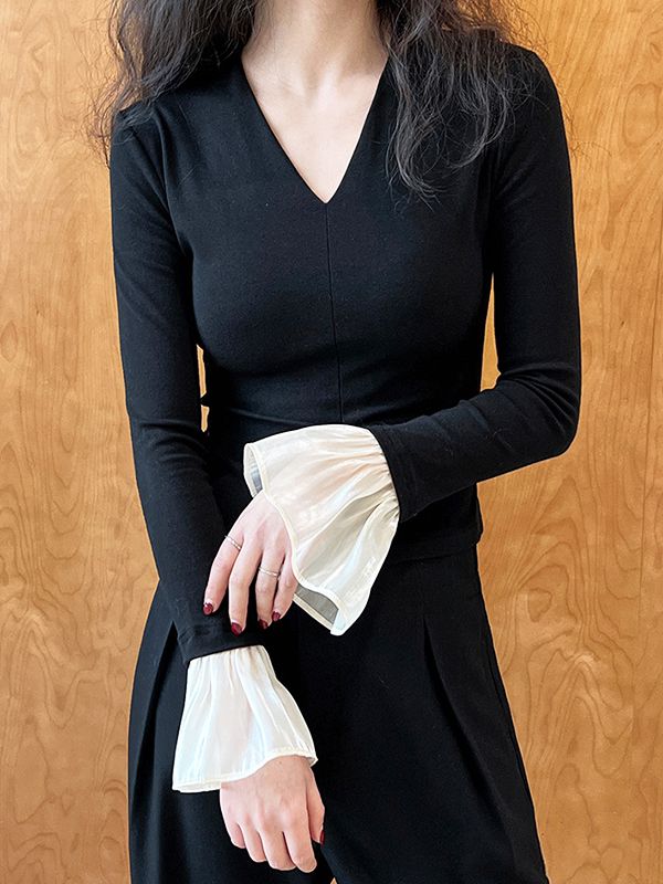 【C60153】品牌 喇叭袖上衣-透紗花邊袖拼接深V領合身長袖上衣★★