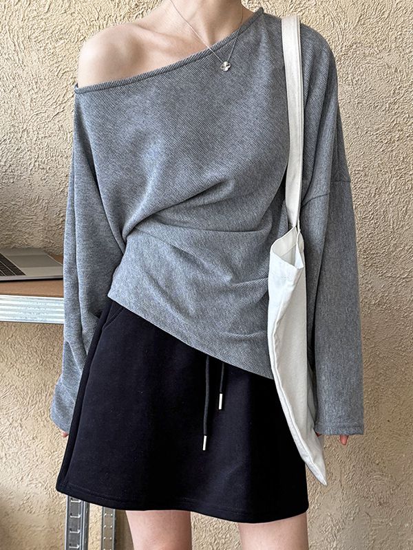 【C60154】品牌 斜肩素面上衣-一字領不對稱斜邊側開衩長袖T恤
