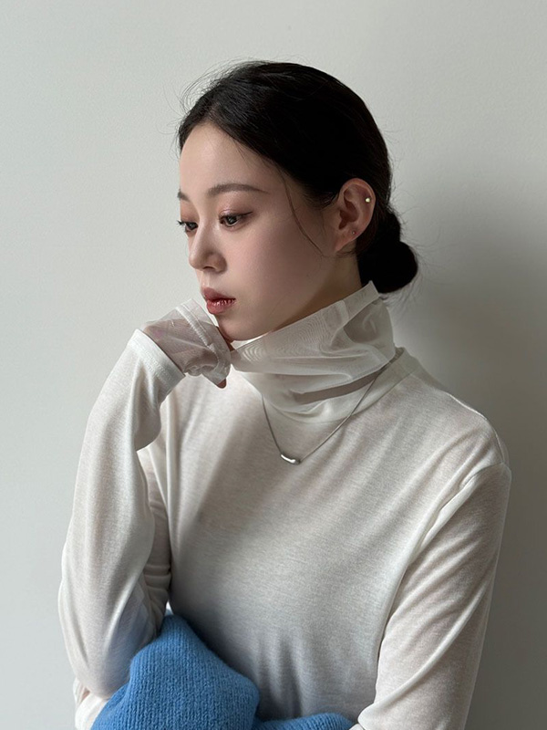 【C60156】品牌 透紗立領上衣-假兩件拼接高領素面內搭長袖T恤