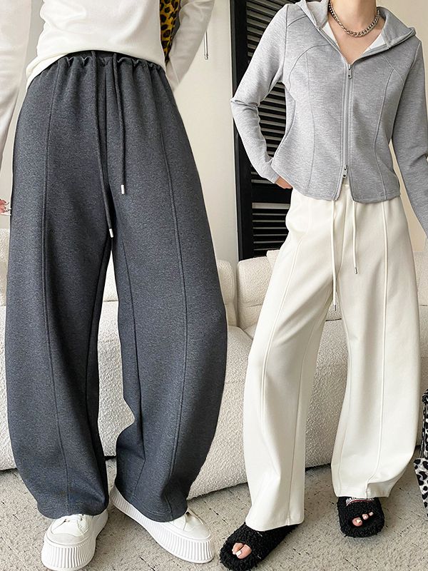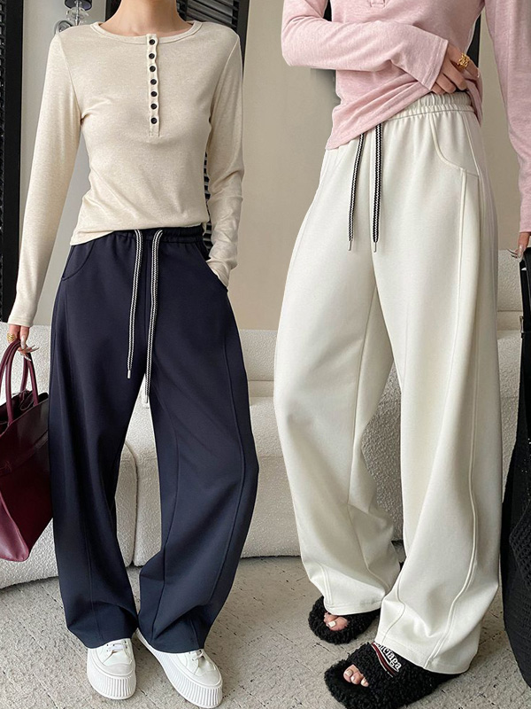 【C60157】品牌 出芽車線運動褲-素面抽繩腰寬褲管彎刀長褲