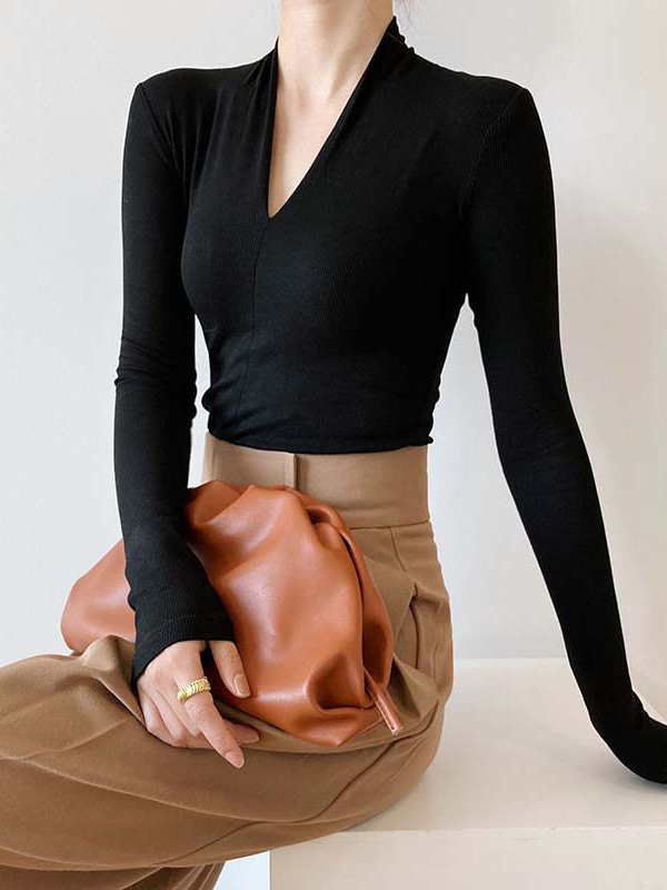 【C60159】品牌 彈力深V領上衣-素面短版貼身內搭長袖上衣
