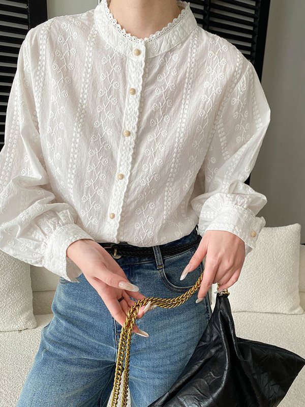 【C60161】品牌 雕花蕾絲襯衫-復古花邊立領素面排釦長袖上衣★★