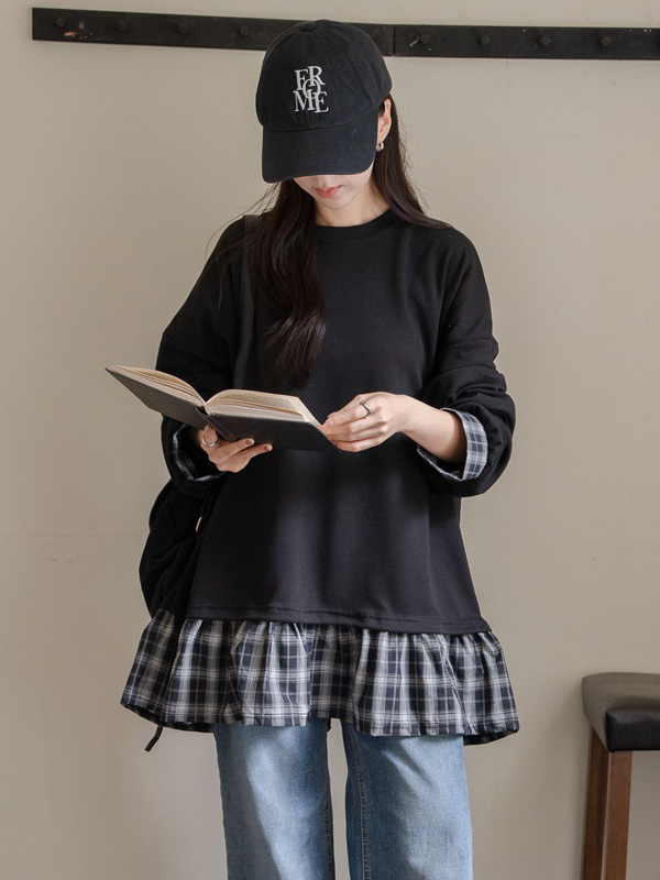 【C55781】韓國GOW 格紋拼接上衣-假兩件花邊下襬寬鬆長版長袖T恤★★