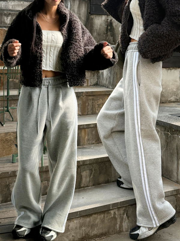 【C55788】韓國MIR 厚磅刷毛運動褲-側邊雙白條紋抽繩腰闊腿長褲