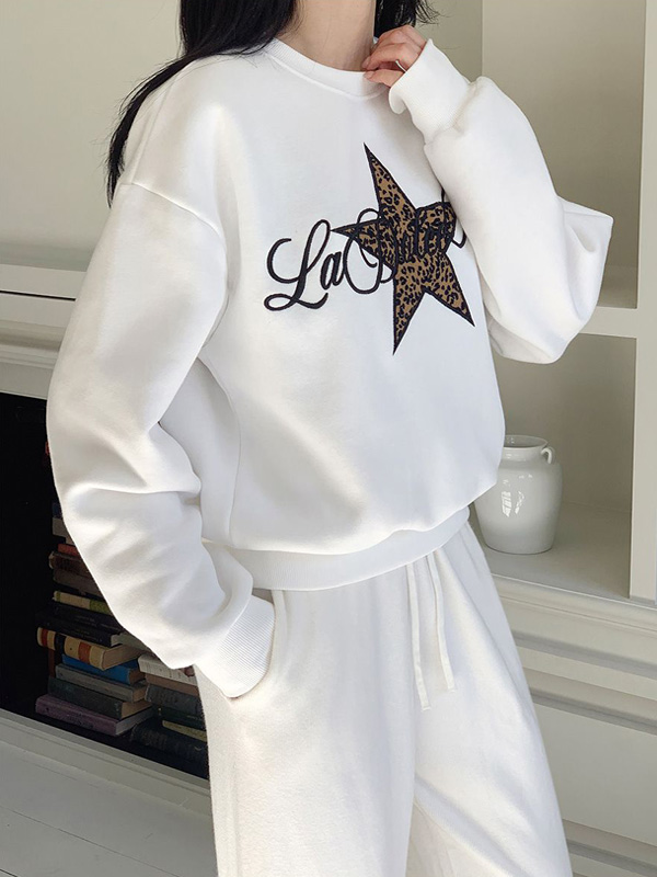 【C55827】韓國MNG 豹紋星星大學T-刺繡字母圓領短版內刷毛長袖上衣