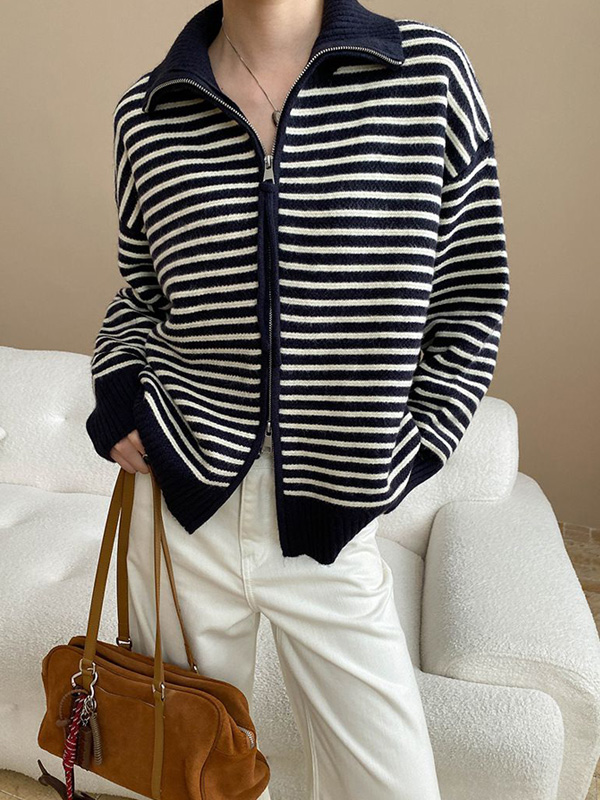 【C60050】品牌 拉鍊立領針織衫-半開襟翻領落肩長袖條紋上衣★★